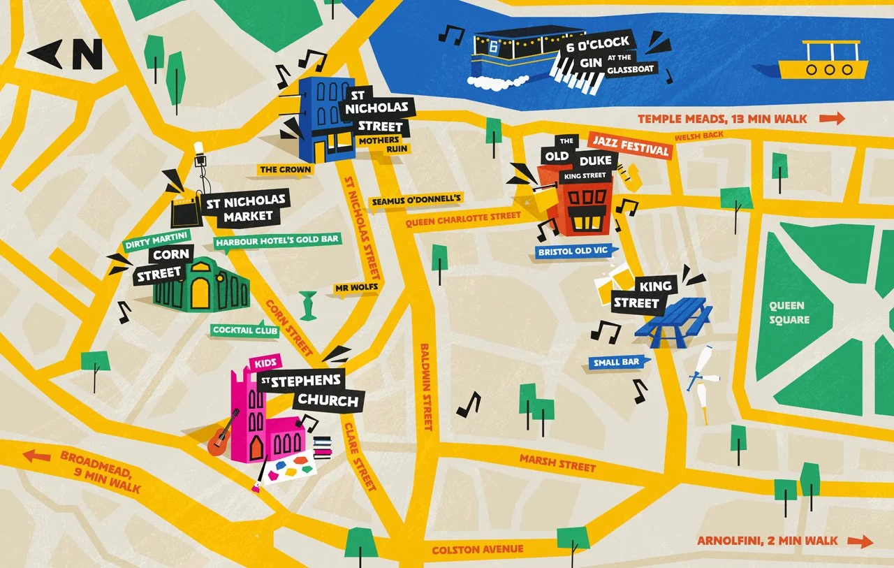 The result was a colourful, graphic map with basic 3D elements taking inspiration from vintage jazz posters that used irregular shapes and straight lines. As this is a family friendly event, the map needed to be functional for adults to find the venues, but also visually playful for children.